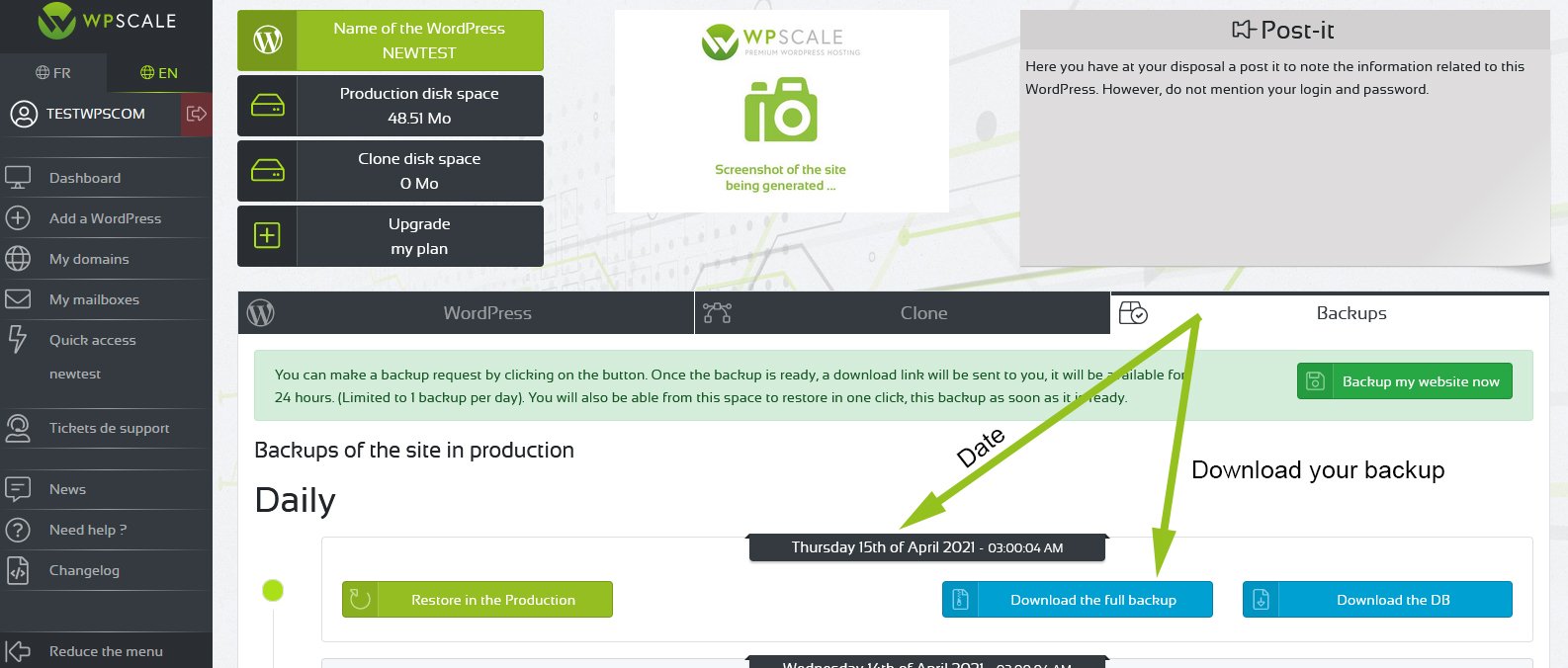 All about Backups. WPScale automatically backs up your WordPress every night, on 7 sliding days and on the 1st of each month for the last three months.