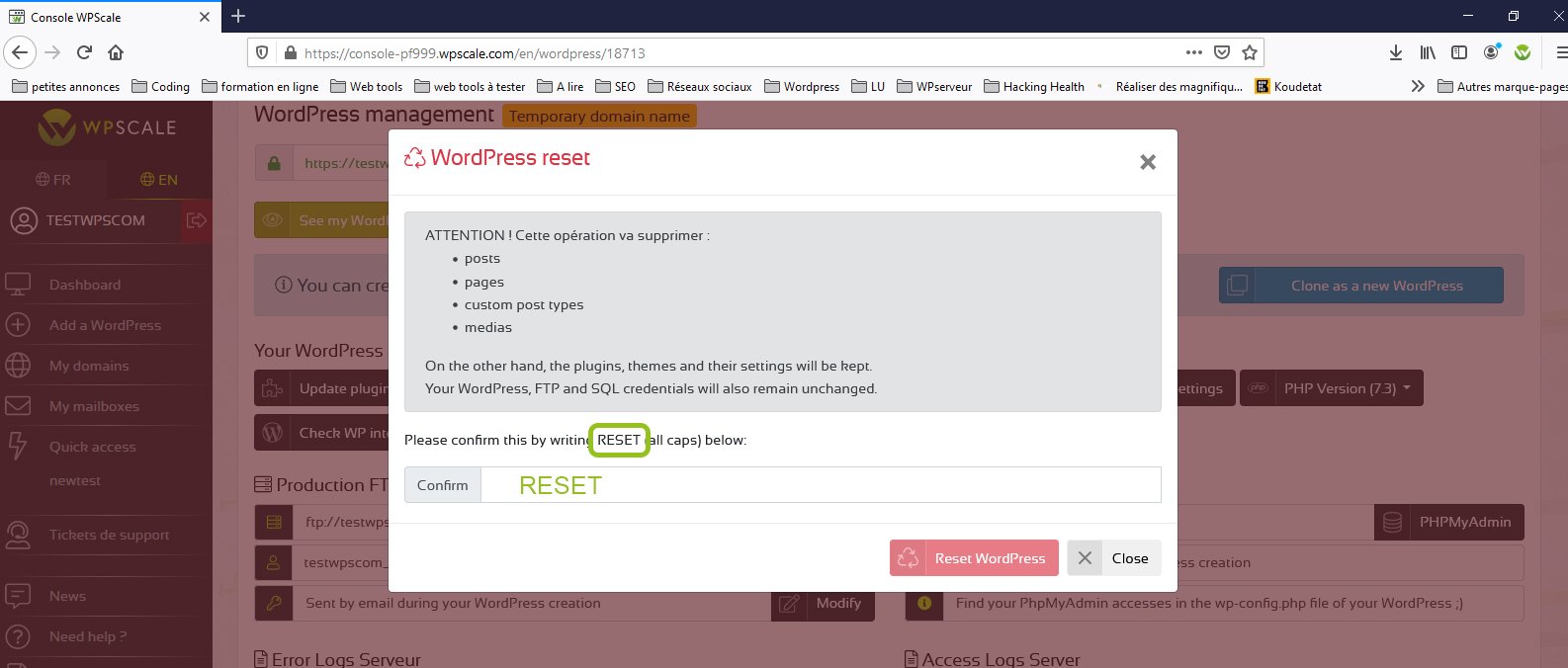By clicking on the button, a dialog box appears on your screen. You must enter in capitals the word RESET to reset your WordPress.