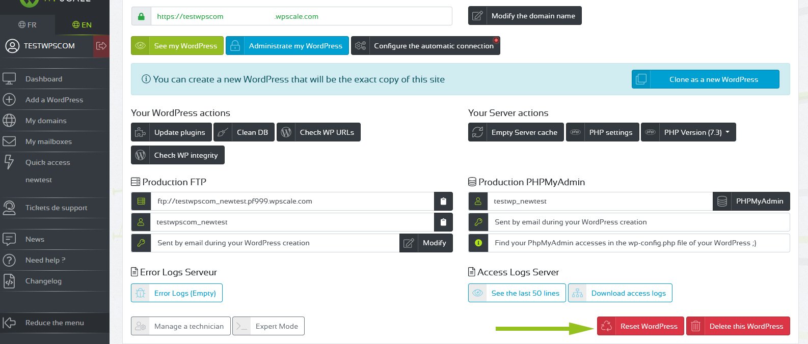 Indeed, instead of deleting and recreating a WordPress, you can do a RESET. In this way, you will keep your plugins, themes and other settings but with a brand new WordPress. This feature is available in the WordPress tab of your console.