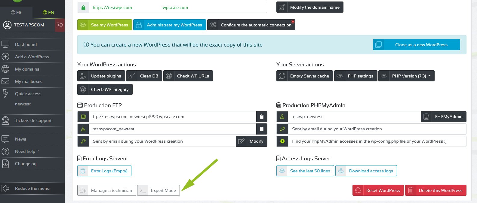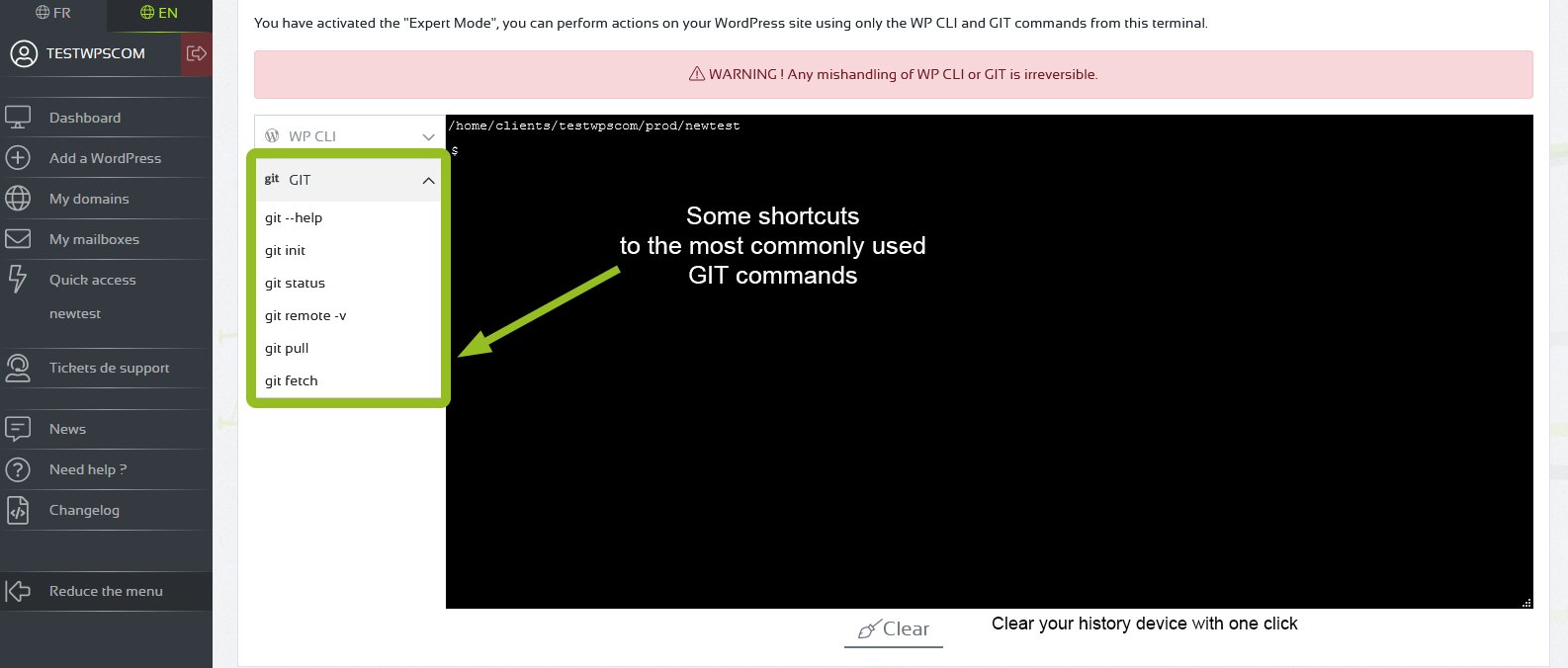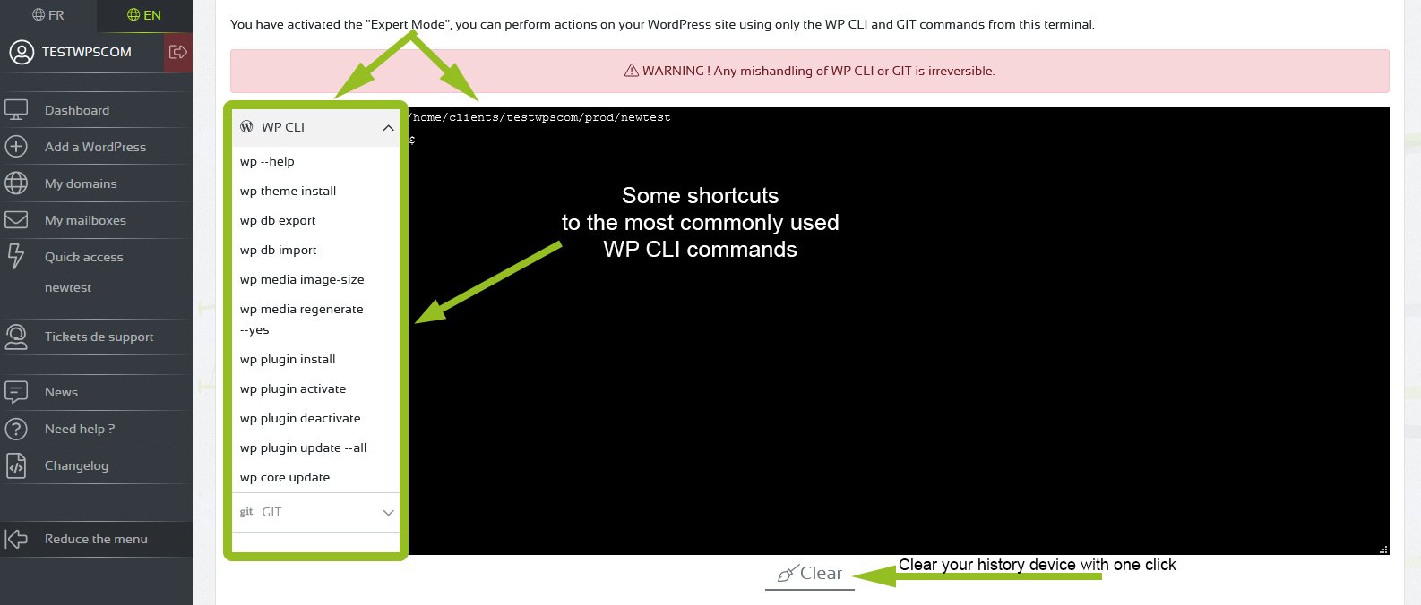 WPScale offers a new functionality - access to a terminal allowing the simplified, secure use of WP-CLI and GIT, allowing you to interact more efficiently on your WordPress command line sites. Expert mode authorises WP-CLI commands to allow the administration of WordPress and GIT sites for version management of your developments.