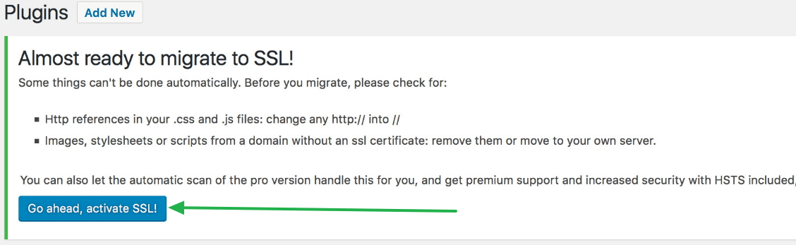 Once this plugin is installed and activated, you’ll see a new box at the top of the page with a blue "Go ahead, activate SSL !" button. Click this button to complete the installation and automatically replace URLs from HTTP to HTTPS.