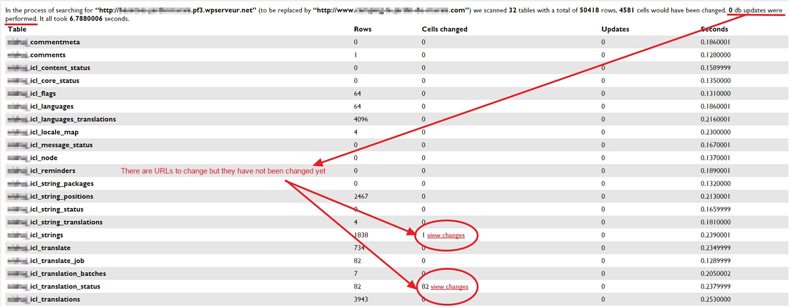 Once the "Dry run" button is clicked, the tool will search for the presence of old URLs and display the tables in which they’re found :