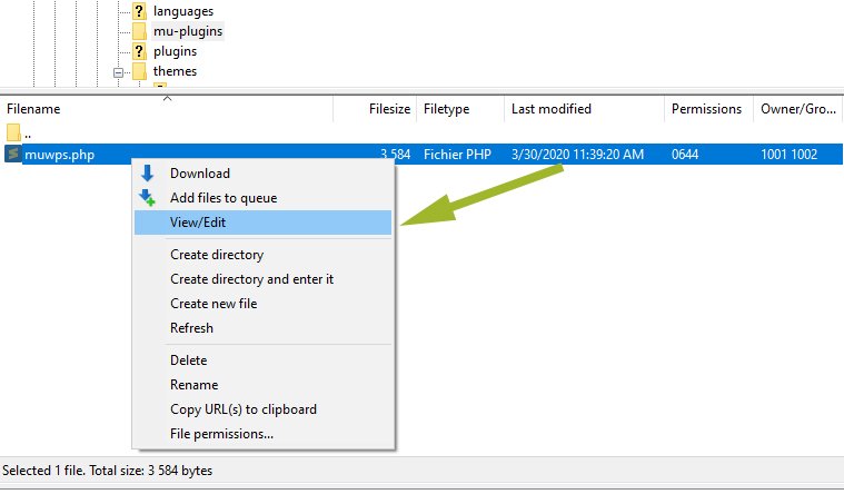 2 : Go to the folder /wp-content/mu-plugins/ and edit the file muwps.php.
