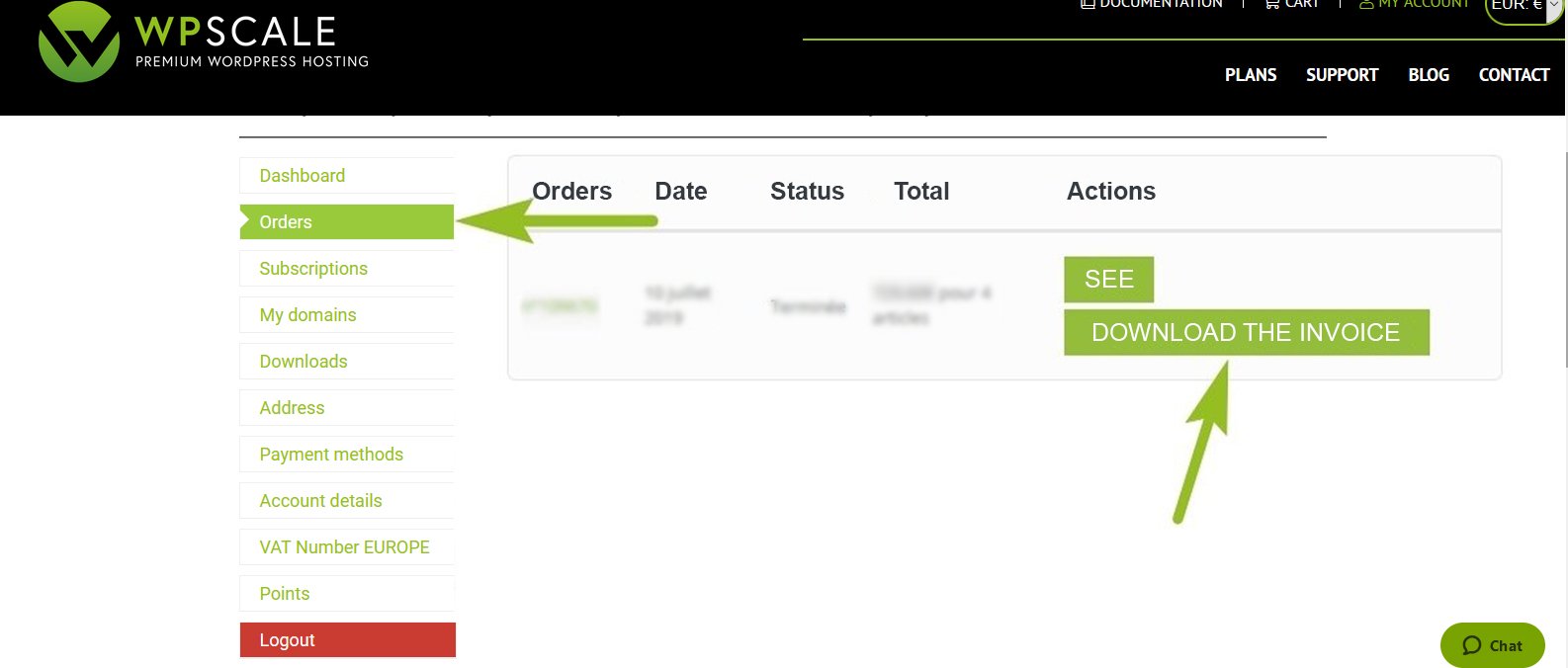 Find all your invoices directly on your WPScale customer account on our website dev.wpscale.com, then click on the "Orders" tab, choose the invoice then click on the green "Download invoice (PDF)" button.