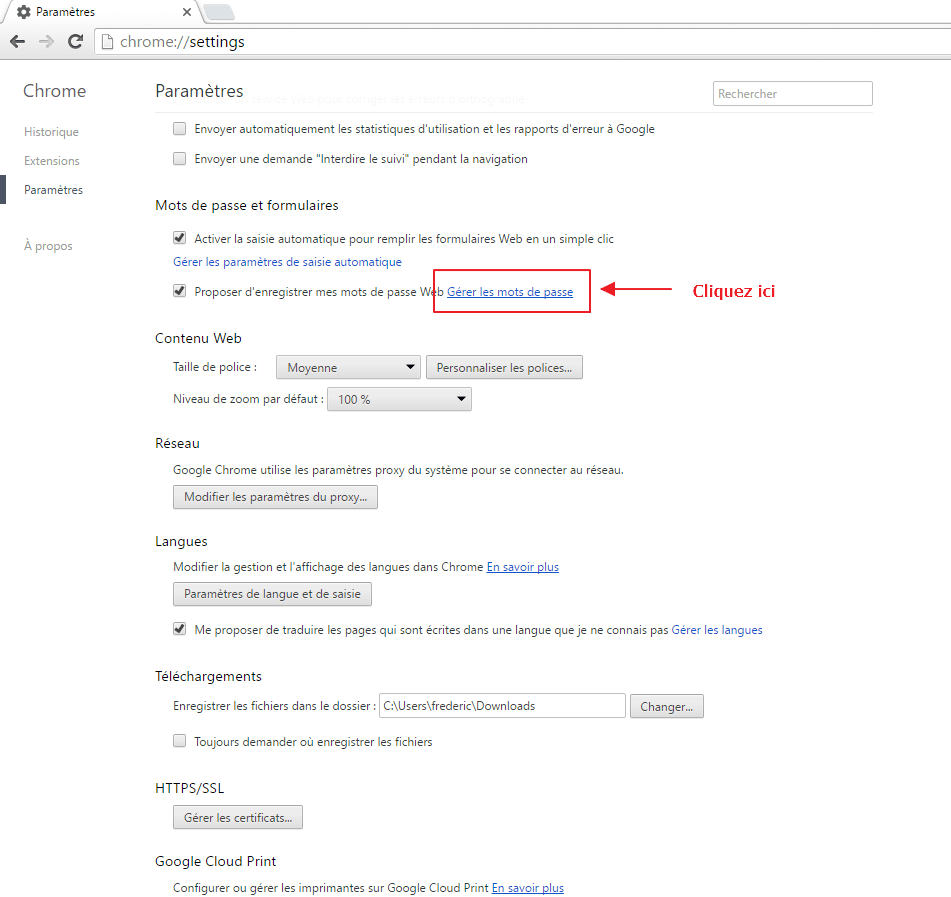 In the section "Passwords and forms", select the menu "Manage passwords".