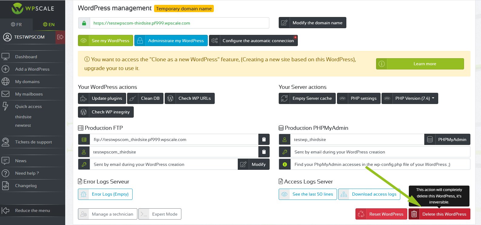 To delete your WordPress, it's a simple action but be careful - it's irreversible ! Deleting one of your WordPress files will also delete its clone and backups.